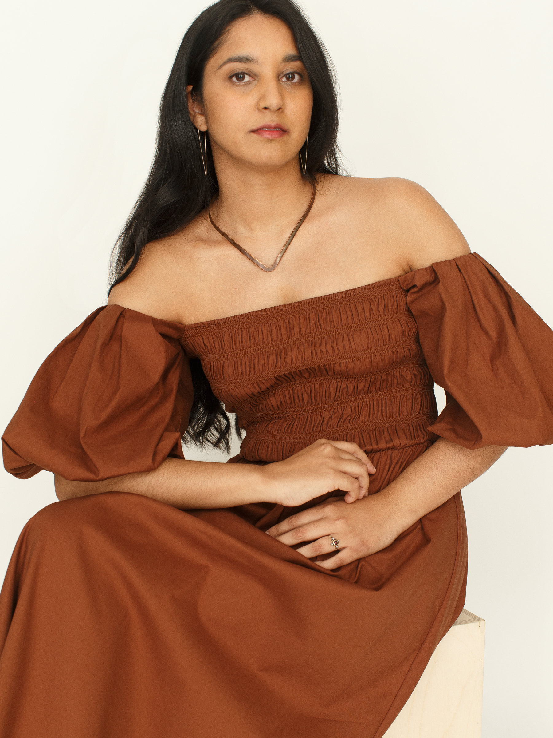 Krystal is wearing the Tuli Dress in CINNAMON.