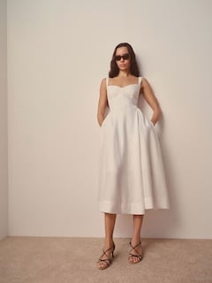 Corsage ajusté et jupe évasée.
