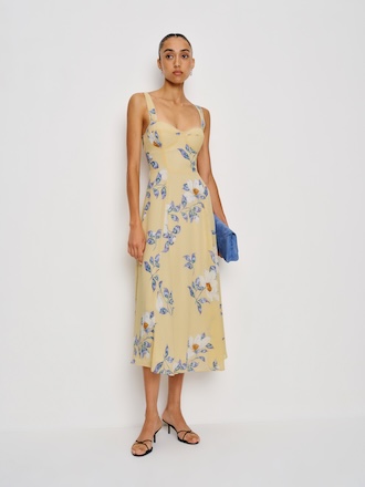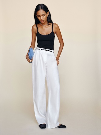 Get on tops. Shop the Whitley Linen Top from Reformation, a v neck linen top with dramatic ruffled sleeves and a tie at the waist.